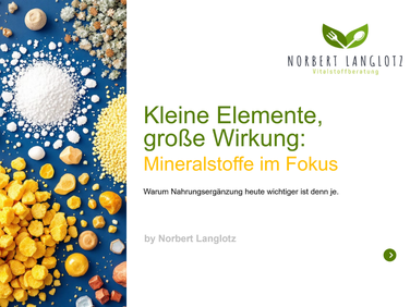 Dieser Vortrag nimmt Dich mit in die faszinierende Welt der Mineralstoffe – jene unscheinbaren, aber unverzichtbaren Bausteine, die in Deinem Körper wahre Wunder bewirken. Du erhältst nicht nur wertvolle Einblicke in ihre Funktionen und Wirkweisen, sondern auch praxisnahe Tipps, wie Du Mangelzustände erkennst und gezielt ausgleichen kannst.